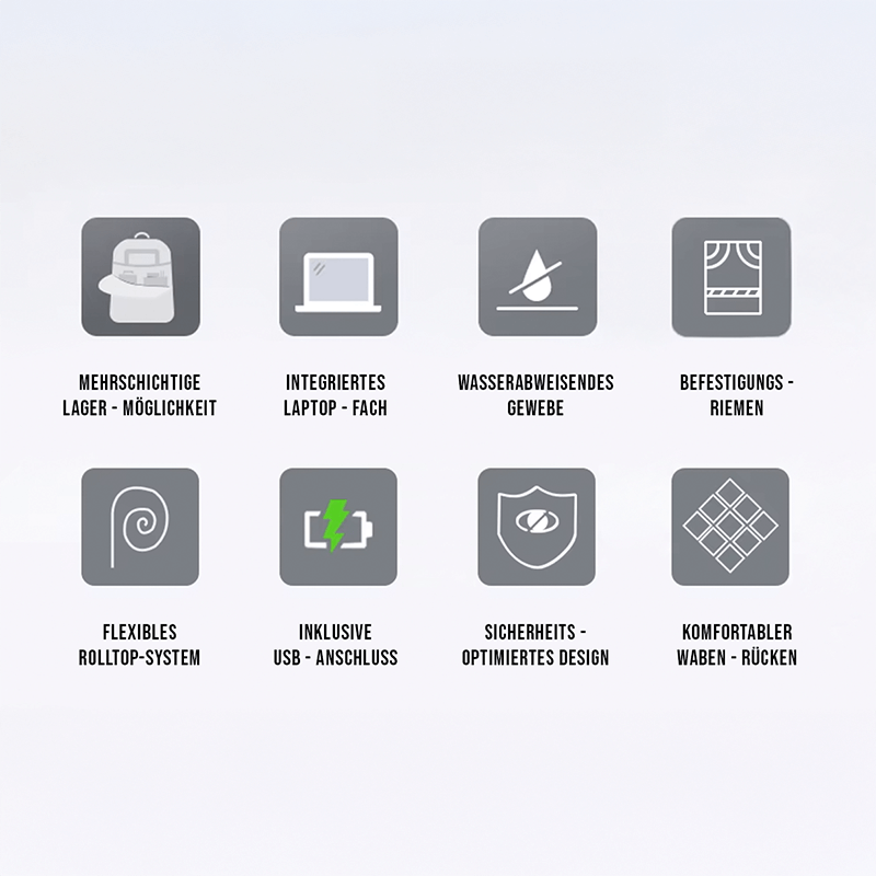 Der ProFlex vereint nicht nur Funktionalität, Stil und Komfort in einem, sondern überzeugt auch mit moderner Technologie und durchdachtem Design – ideal für urbane Abenteurer, Geschäftsreisende und Outdoor-Enthusiasten.